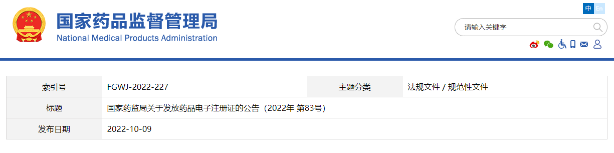 為貫徹落實(shí)黨中央、國務(wù)院關(guān)于深化“放管服”改革的重要決策部署,優(yōu)化營商環(huán)境,進(jìn)一步激發(fā)市場(chǎng)主體發(fā)展活力,為企業(yè)提供更加高效便捷的政務(wù)服務(wù),經(jīng)研究決定,自2022年11月1日起,發(fā)放藥品電子注冊(cè)證,F(xiàn)將有關(guān)事項(xiàng)公告如下: