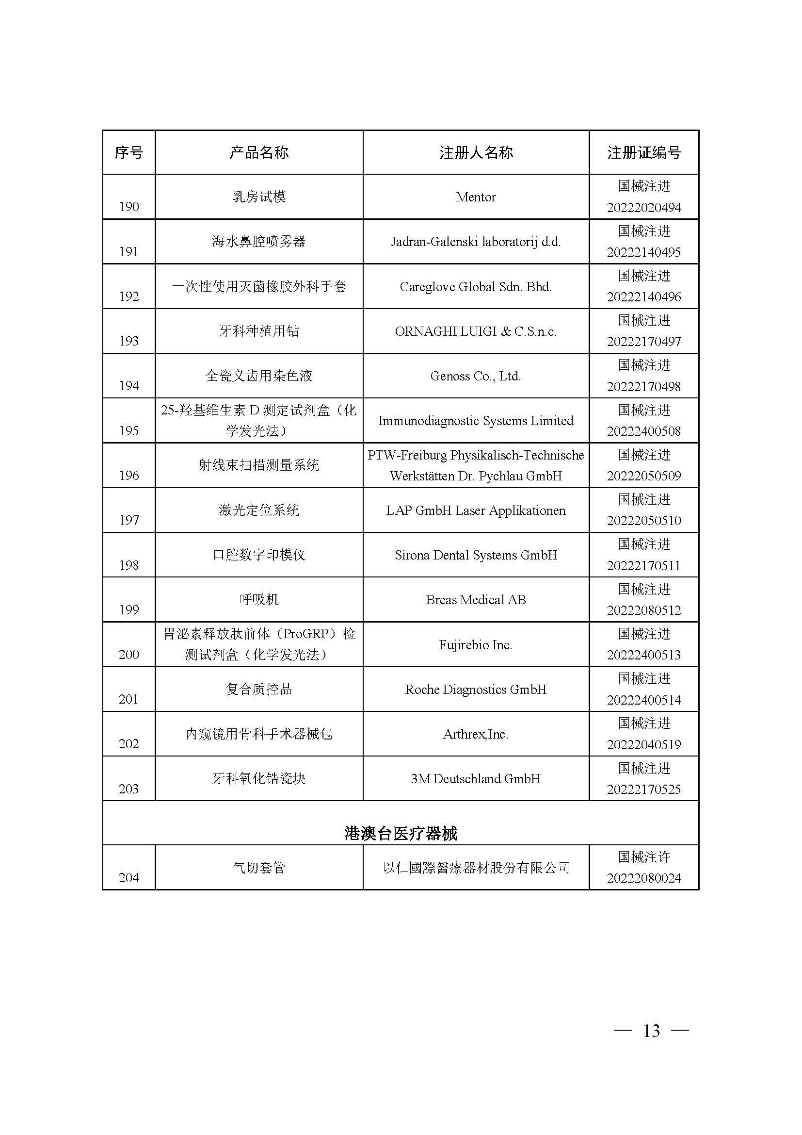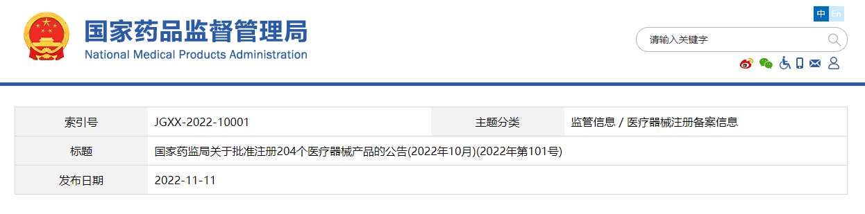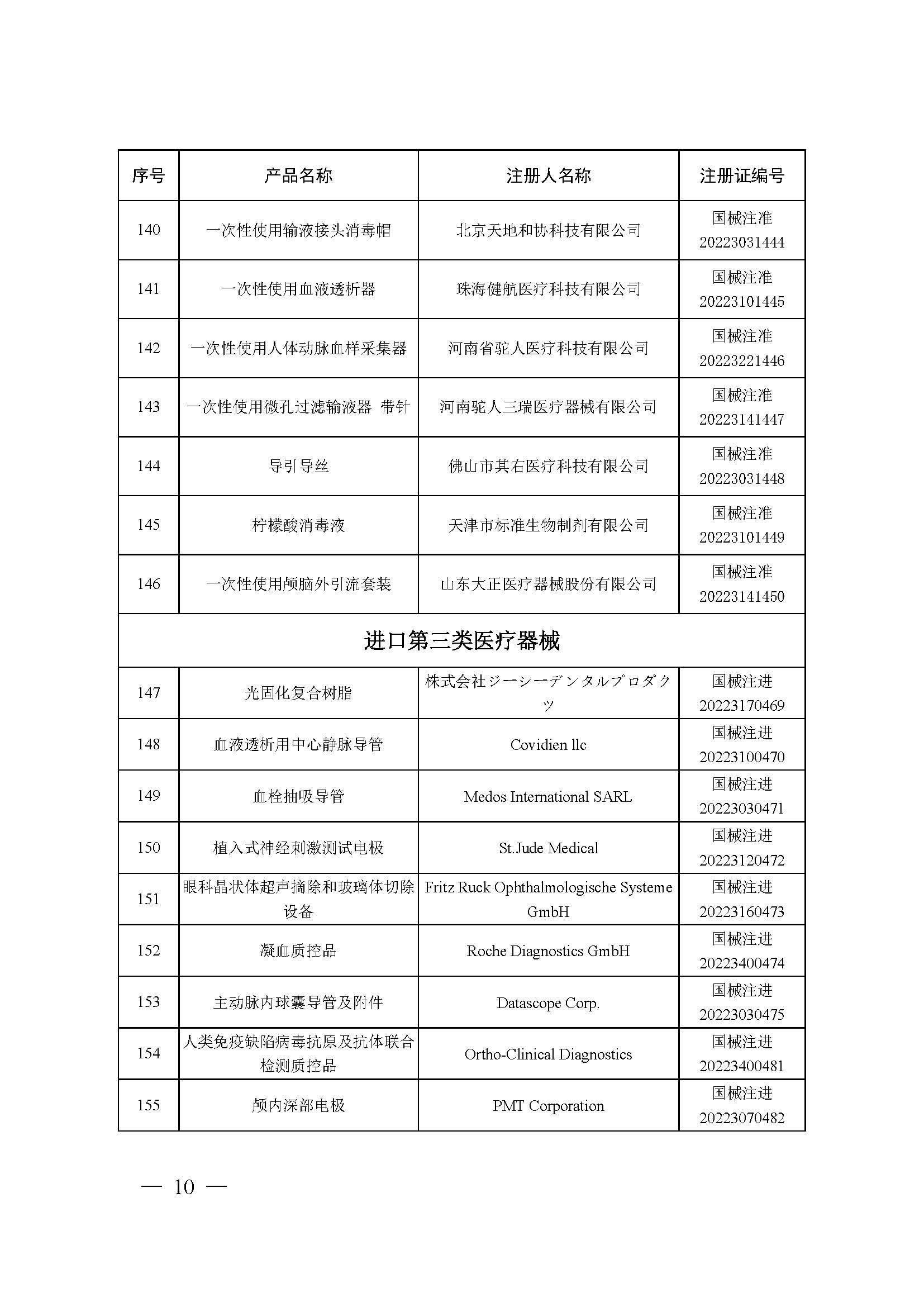 2022年10月,國家藥品監(jiān)督管理局共批準(zhǔn)注冊(cè)醫(yī)療器械產(chǎn)品204個(gè)。其中,境內(nèi)第三類醫(yī)療器械產(chǎn)品146個(gè),進(jìn)口第三類醫(yī)療器械產(chǎn)品34個(gè),進(jìn)口第二類醫(yī)療器械產(chǎn)品23個(gè),港澳臺(tái)醫(yī)療器械產(chǎn)品1個(gè)(具體產(chǎn)品見附件)。