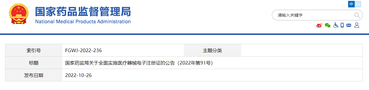 國家藥監(jiān)局關于全面實施醫(yī)療器械電子注冊證的公告(2022年第91號)