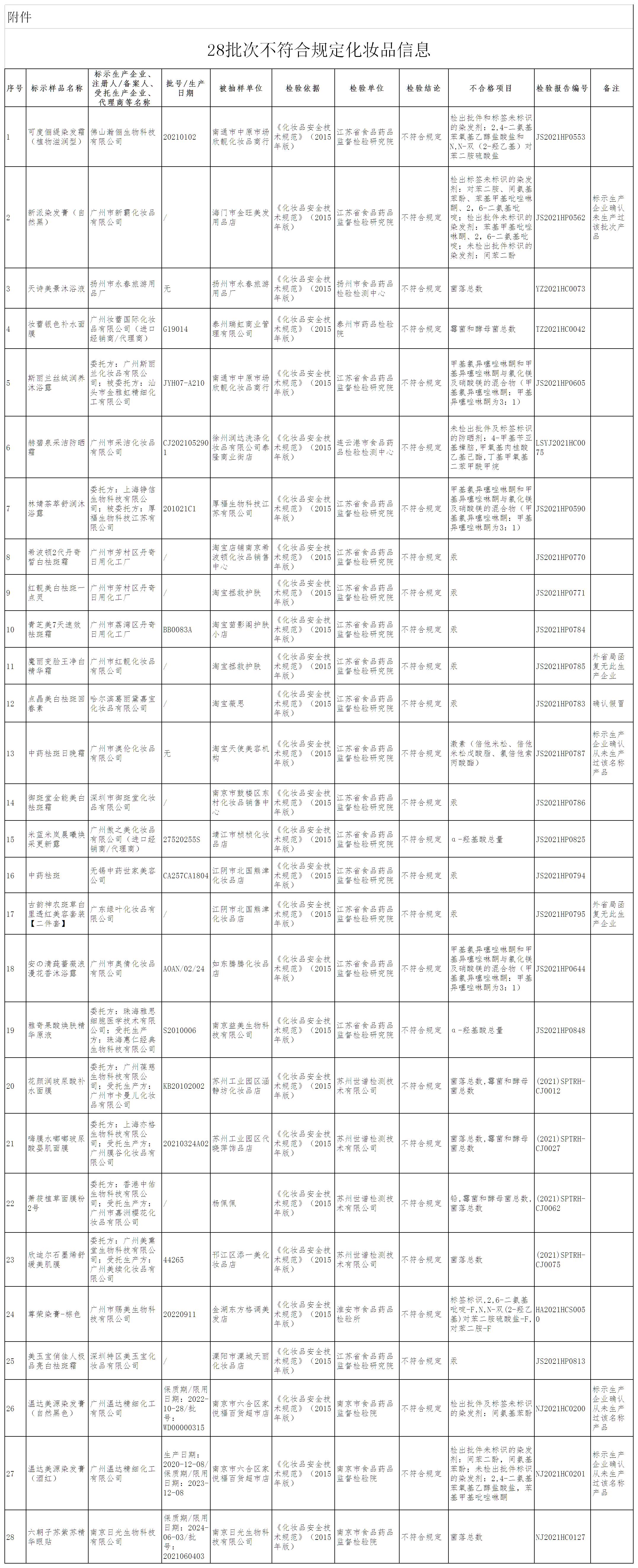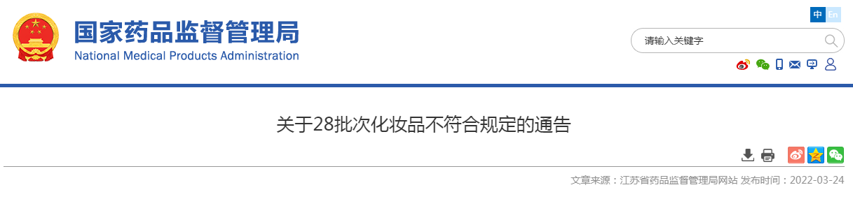 依據(jù)年度抽檢工作計劃,江蘇省藥品監(jiān)督管理局組織對部分化妝品生產(chǎn)、經(jīng)營單位進行了抽檢,現(xiàn)將抽檢中發(fā)現(xiàn)的28批次不符合規(guī)定的化妝品信息予以通告(詳見附件)。